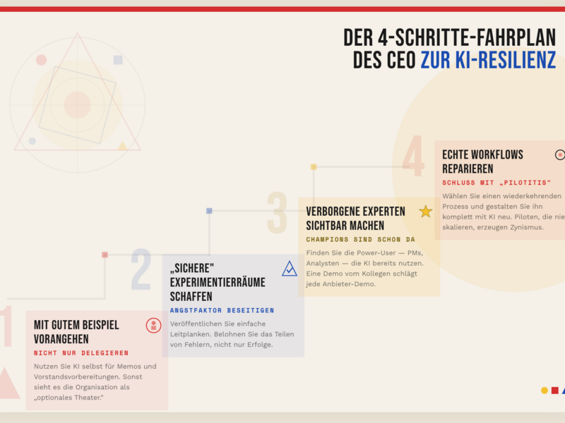 Wählen Sie zwei oder drei Workflows und bauen Sie sie richtig. Hören Sie auf, Ressourcen auf fünfzig Piloten zu verteilen. Wählen Sie Workflows, die häufig, schmerzhaft und sichtbar sind – die Dinge, die die Leute täglich frustrieren. Integrieren Sie KI in die Tools, die sie bereits nutzen. Verfolgen Sie, was sich ändert. Machen Sie Ergebnisse sichtbar. Wenn die Leute sehen, dass es funktioniert, fragen sie danach. Das ist der Moment, wo Adoption zu Momentum wird.